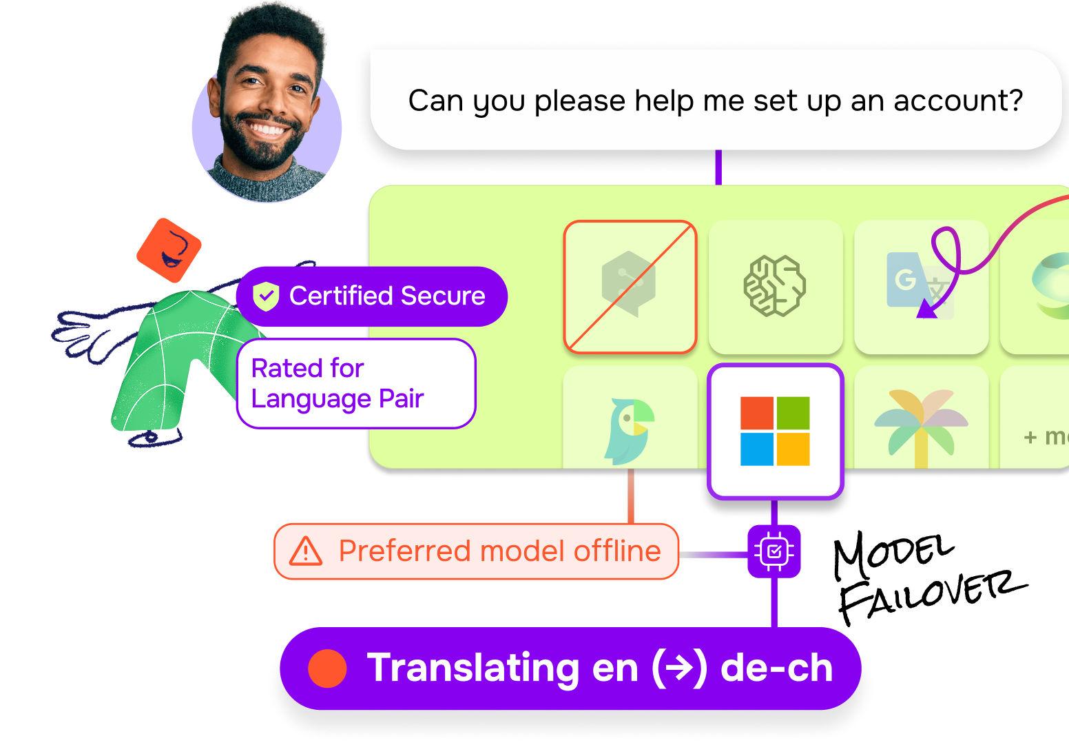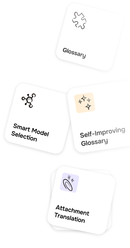 With Smart Model Selection, our system intelligently selects the best translation model based on language pair and context, ensuring high-quality translations. This ensures you have the most accurate and reliable model for translations, which helps prevent misinterpretations, reduces customer frustration, and lowers support costs.