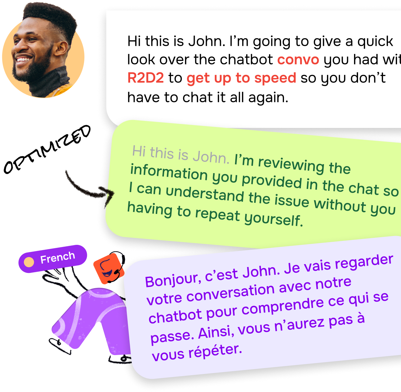 Skip the manual prep work—our AI-driven tools automatically assess and optimize your customer conversations for fluent, accurate translations as they happen. Support reps can engage with customers in their preferred language without interruption, ensuring fast, seamless communication that feels natural on both ends.