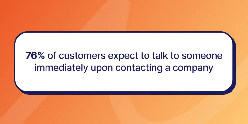 - Among some other important call center statistics, 76% of customers expect to talk to someone immediately upon contacting a company (Zendesk)