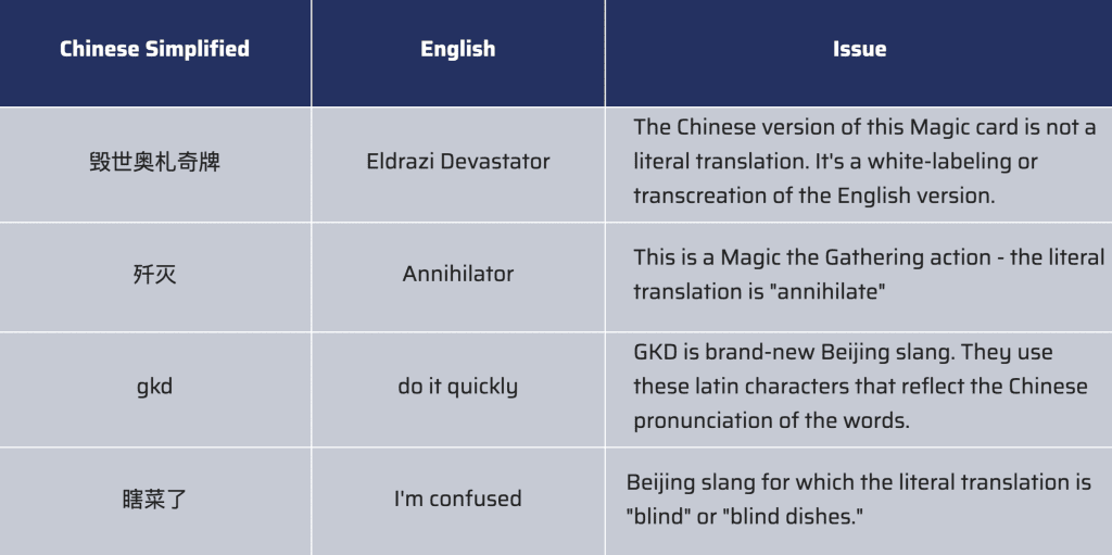 We’ll begin with an example from the gaming world. One of Language I/O’s customers received the following support request from a player in Beijing. It’s a great example because it not only includes recently invented slang, but it also uses terms that were specifically invented for Magic the Gathering (MTG). In this customer support request, which is in Chinese, the bolded words are the ‘problematic’ terms and phrases.