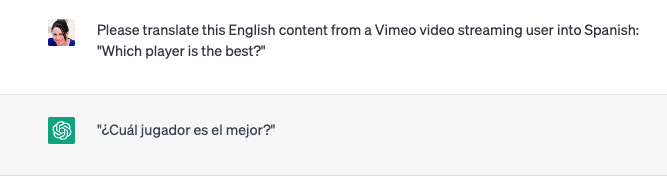 The word “player,” when translated into the context of a video streaming website, should be translated into Spanish as “reproductor.” Here, we can see ChatGPT, even when given information about the use case, still translates “player” into “jugador,” which refers to a sports player (or, athlete). That translation may work for our online gambling clients, for whom “player” always refers to an athlete on which customers are placing a bet, but it doesn’t work here.