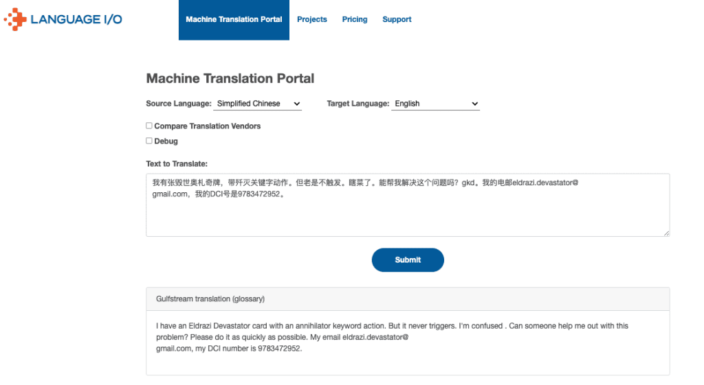 Keeping with our Eldrazi Devastator example, the below screenshot demonstrates how Language I/O’s technology translates that same gamer’s query from Chinese to English. Our platform first selects the best engine for fluency between Chinese and English, and then instructs that engine in real time how the brand requires any specialized terminology to be translated (or, in some cases, not translated).