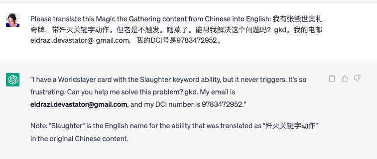 We attempted to translate this Chinese support request into English through ChatGPT, and added the context that this is related to MTG in an attempt to assist the translation: