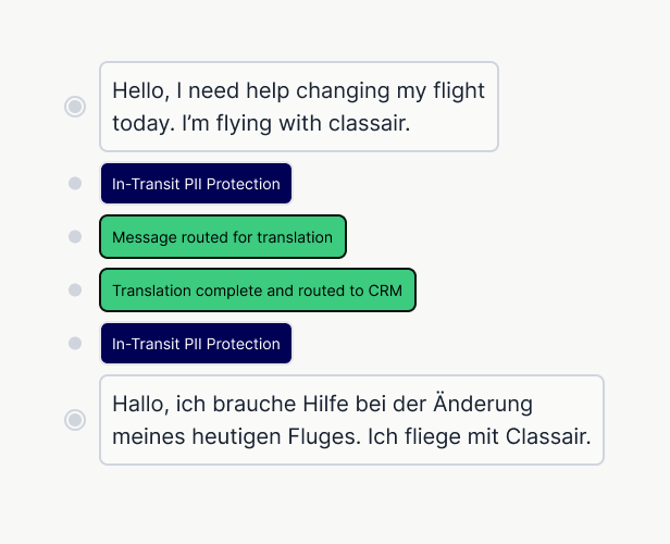 Any personally identifiable information is automatically detected and encrypted before translation.